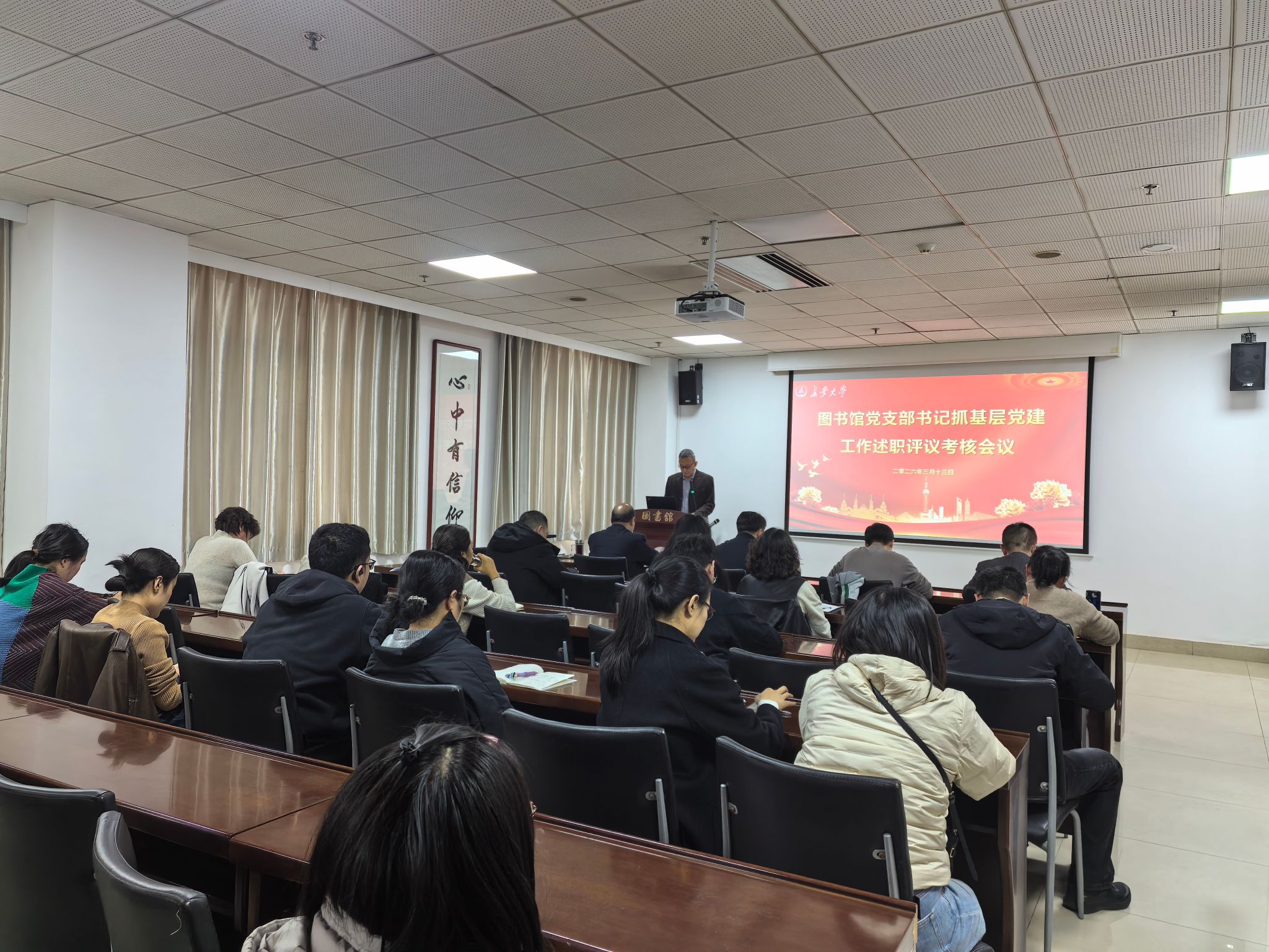 2026年3月13日,图书馆党总支在北校区图书馆402研讨室召开了2025年度图书馆党支部书记抓基层党建工作述职评议考核会议,全体领导班子成员、各部室负责人、各党支部书记、党员代表参加会议,会议由党总支书记魏奕主持。