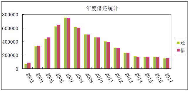 长安大学图书馆汇文系统有记录以来,流通借还量呈现较大的变化。在汇文系统运行的前阶段,年度借还呈现直线增长,2003年图书借阅88677册,至2007年达到借阅高峰,年借阅量达745045册。一方面,高校扩招后学生数量增长带来借阅量的增长,另一方面,个人电脑还尚未达到非常广泛的普及;再者,读者对电子文献的认知与接受程度处于起步发展阶段,因此,此段时期纸质图书借阅量较大。随着电子图书的迅速发展,纸质图书借阅量急剧下降,至2017年已降至154696册。纸质文献资源与电子资源的协调发展是图书馆面临的重要问题。